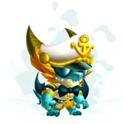 It has azure skin, a yellow-white underbelly, two dark brown-yellow horns, yellow-orange fur on the head, and two large fins. Its outfit is the white maritime cap with a golden-like anchor, black bowtie, white shirt with golden top of sleeves and zip and black belt with golden anchor.