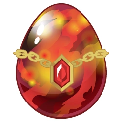 A fiery, molten red and orange color scheme that seems to swirl with energy. It’s adorned with a golden chain wrapped around its middle, holding a red gemstone centerpiece that glows ominously. The overall design gives the egg a regal yet dangerous aura, hinting at the powerful dragon inside.