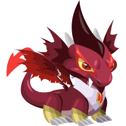 A small and fierce-looking, with deep crimson scales and bright, piercing yellow eyes. It has short wings tipped with a darker red and small golden claws. A white patch runs down its chest, adding contrast to its fiery color palette. Despite its size, it carries an intimidating and mischievous expression, already showing traces of its vampiric nature.